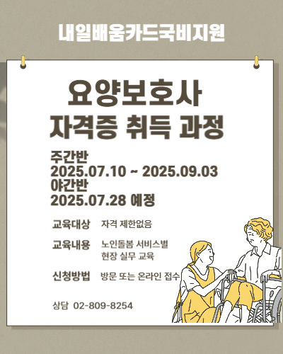 07월 10일 개강 ~ 09월 04일 요양보호사자격증 취득 신입생을 모집합니다.